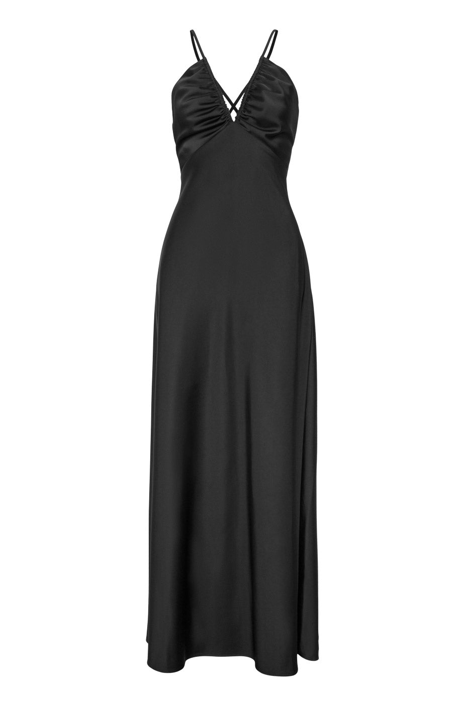 En elegant og sofistikert slip-kjole i champagnefarget sateng, designet med dyp V-utringning og en flowy maxiskjørt – perfekt for lag-på-lag-styling eller alene for en uanstrengt chic look.