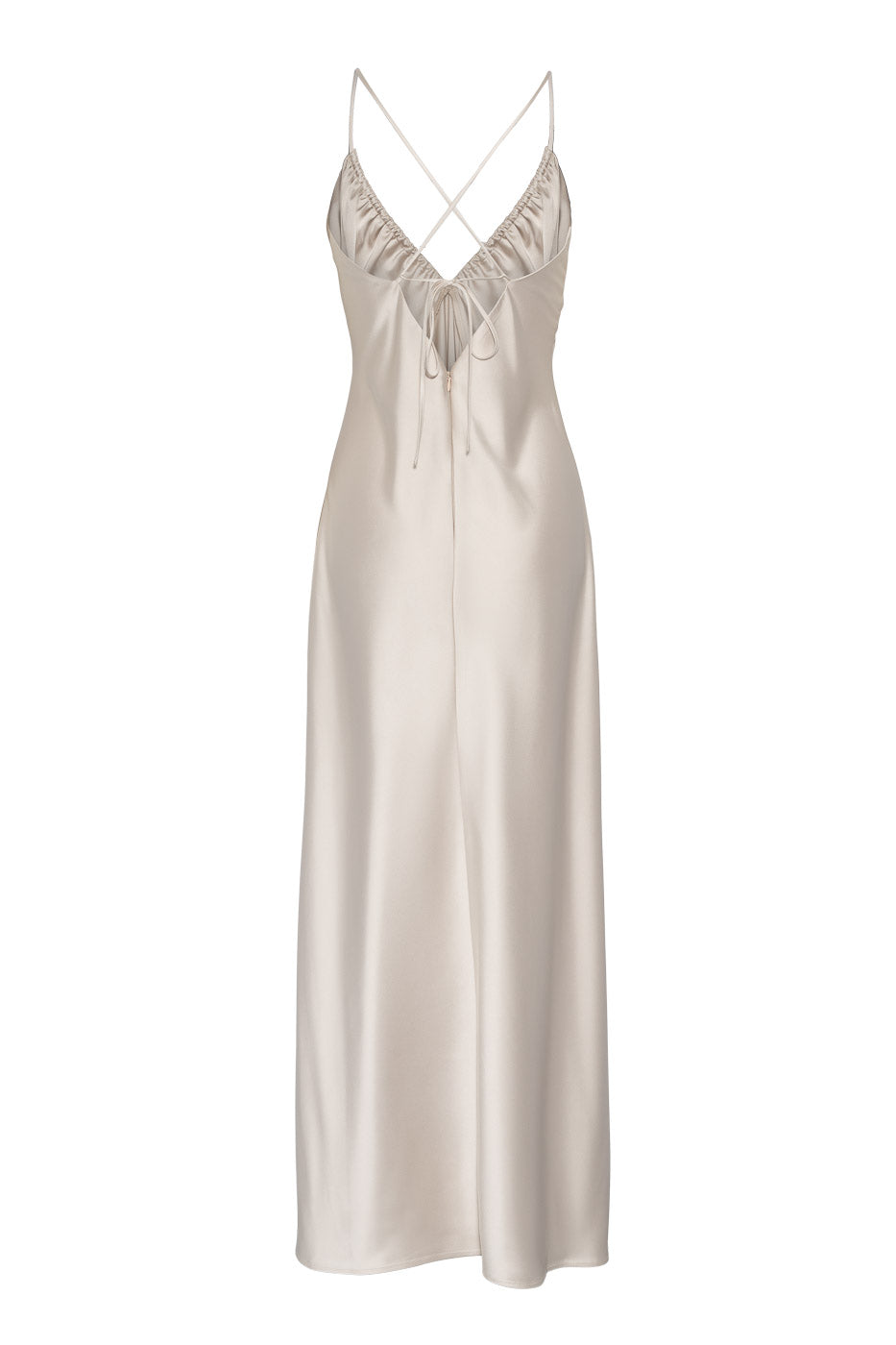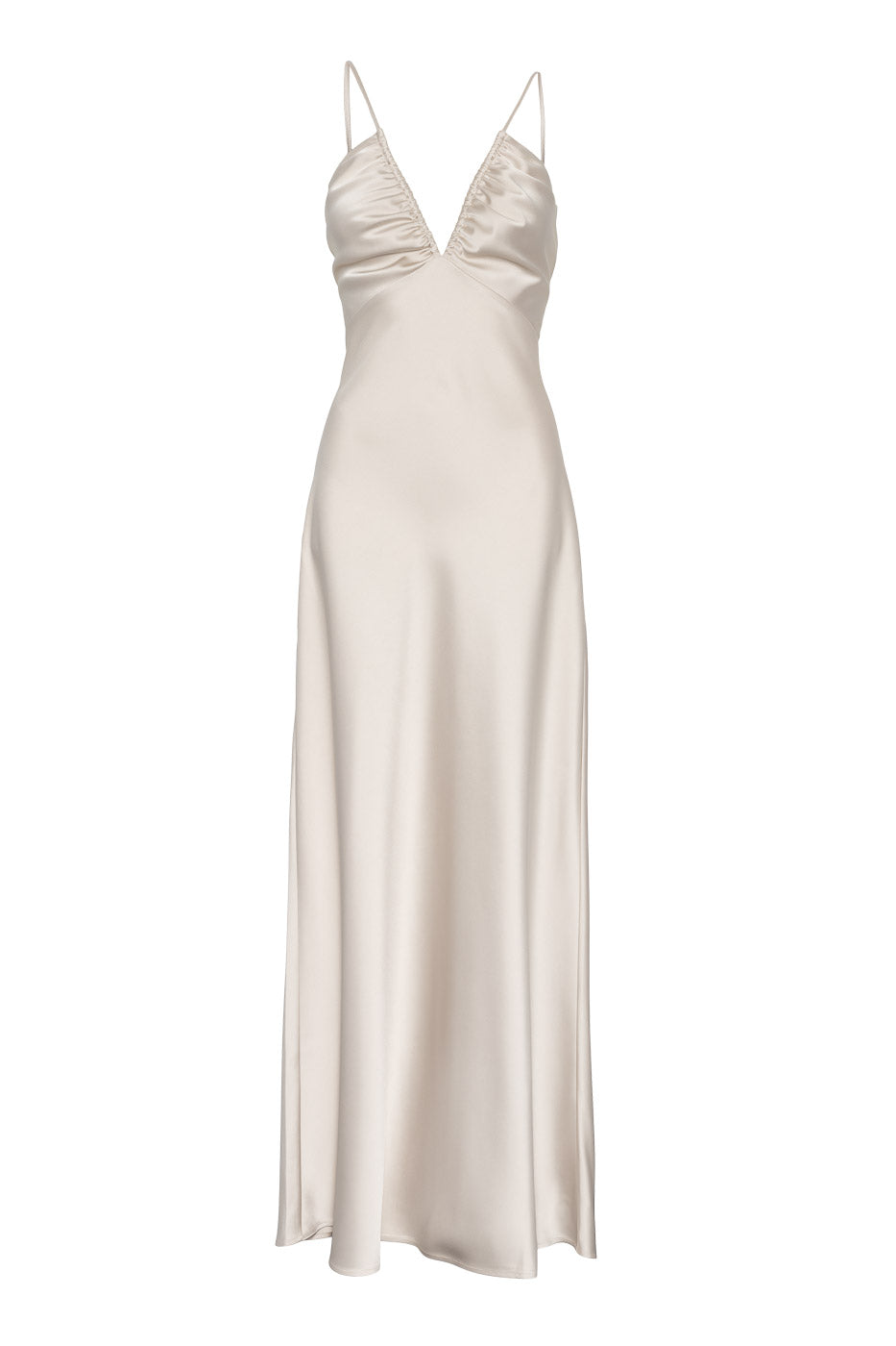 En elegant og sofistikert slip-kjole i champagnefarget sateng, designet med dyp V-utringning og en flowy maxiskjørt – perfekt for lag-på-lag-styling eller alene for en uanstrengt chic look.