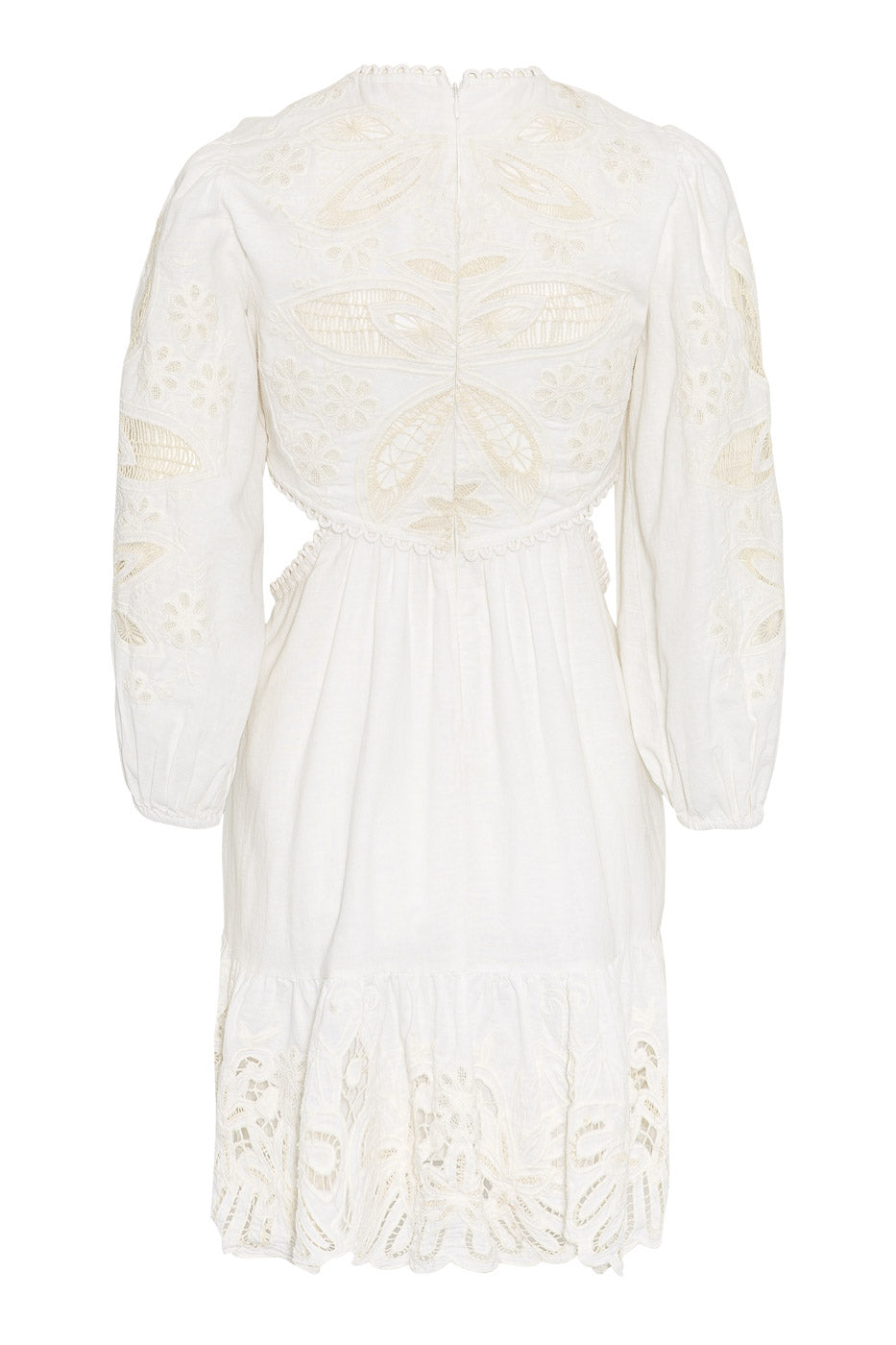 A romantic white mini dress crafted from intricate embroidered fabric. Designed with a high neckline, long voluminous sleeves, and delicate cut-out details at the waist, this feminine style is perfect for summer celebrations, bridal events, and special occasions.