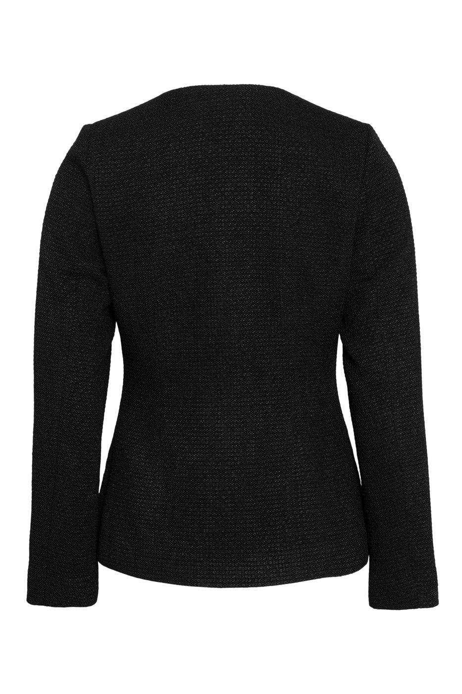 En feminin tweedblazer i sort med innsvinget midje, knappelukking og myk sweetheart-utringning – ideell for kontorantrekk eller elegante hverdagslooker.