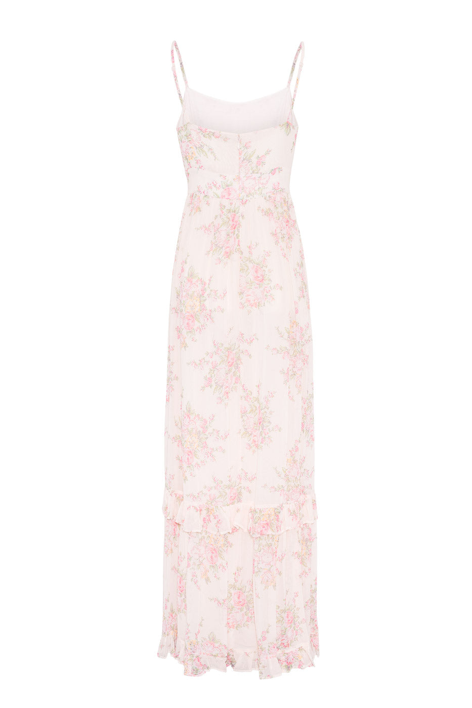A romantic maxi dress in a delicate blush pink floral print, designed with thin adjustable straps and a flattering fitted bodice. The flowy skirt with subtle ruffle detailing adds light movement and an airy feel - perfect for summer days, garden parties, and special occasions.