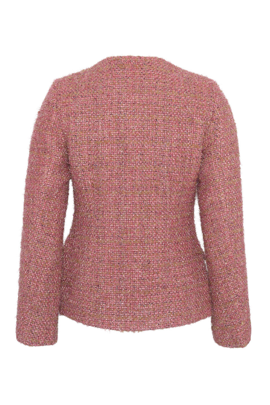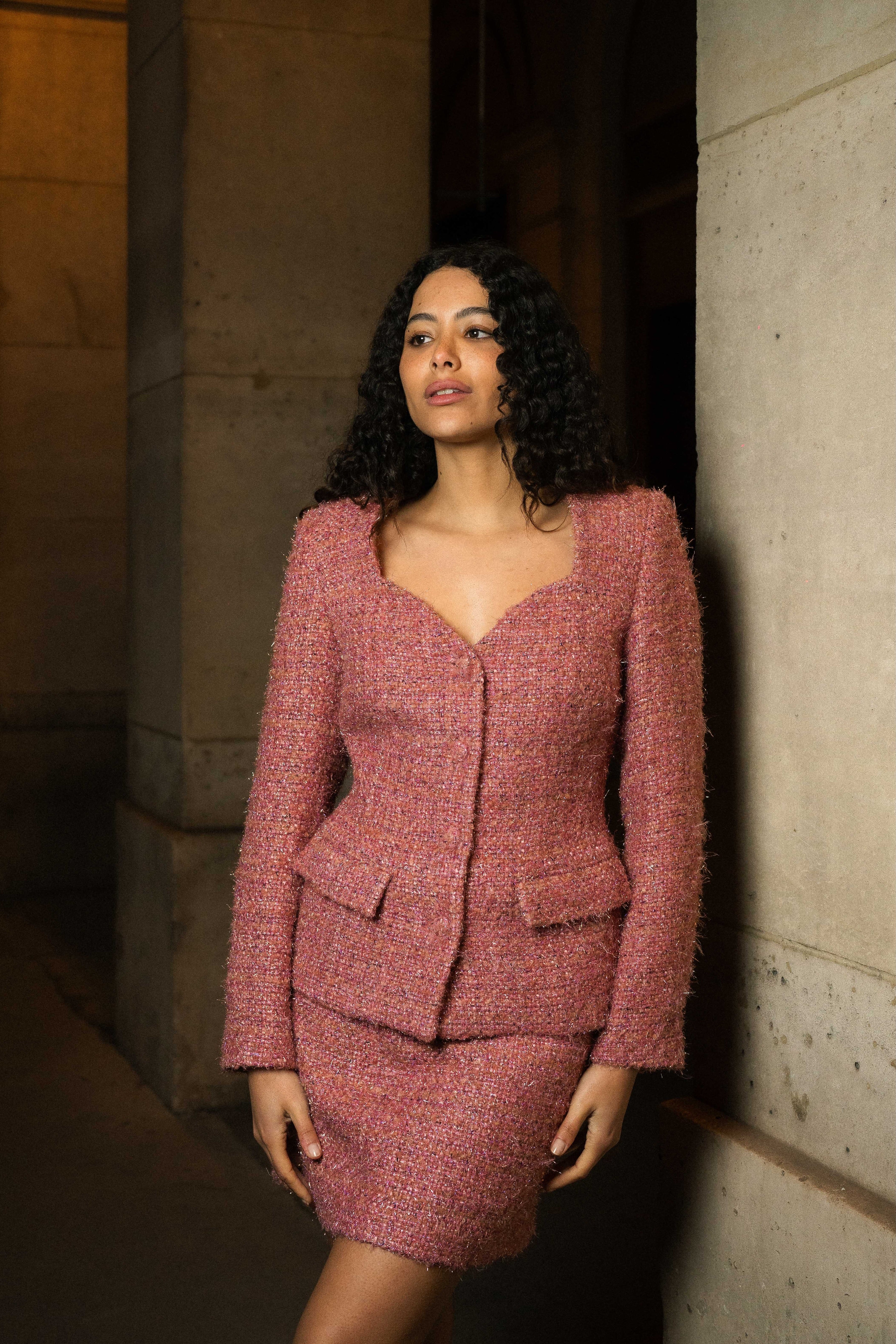 A feminine tweed blazer in rose with a sculpted waist, button closure, and soft sweetheart neckline - ideal for office wear or elegant everyday looks.